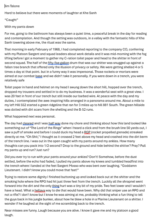 This event was originally told in the jargon typical for that period for Grunts and Seabees during the “Siege” of Khe Sanh . A moment forever burned into my memory, I laugh and cry, miss those guys