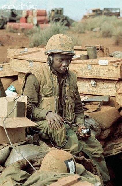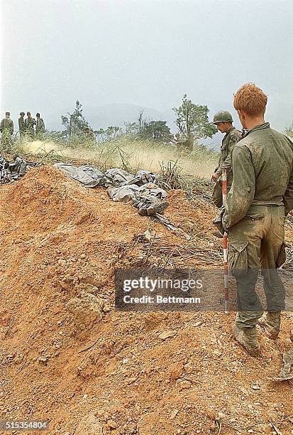 4/4/1968-Near Khe Sanh, South Vietnam- First Cavalry soldiers stand with the bodies of dead comrades, as they wait to be evacuated from a hilltop along route #9, during their advance toward Khe Sanh.