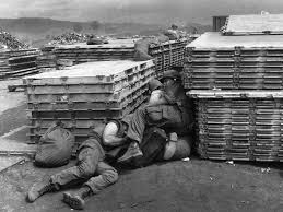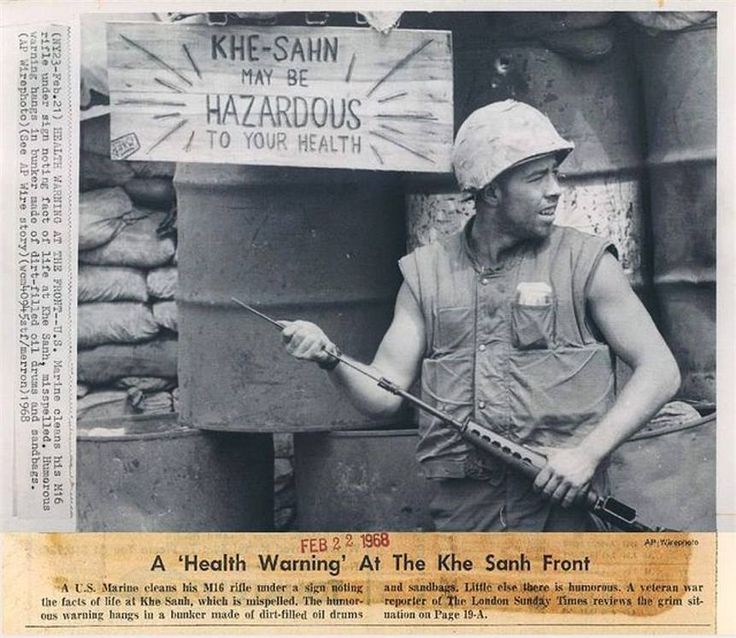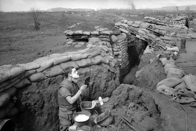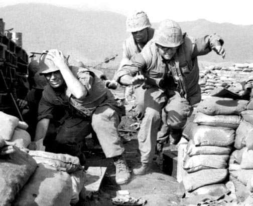 United States troops take cover behind a defensive wall of sand bags during an attack by North Vietnamese Army forces during the Battle of Khe Sanh in South Vietnam during the Vietnam War conflict in 1968. (Photo by Rolls Press/Popperfoto via Getty Images/Getty Images)