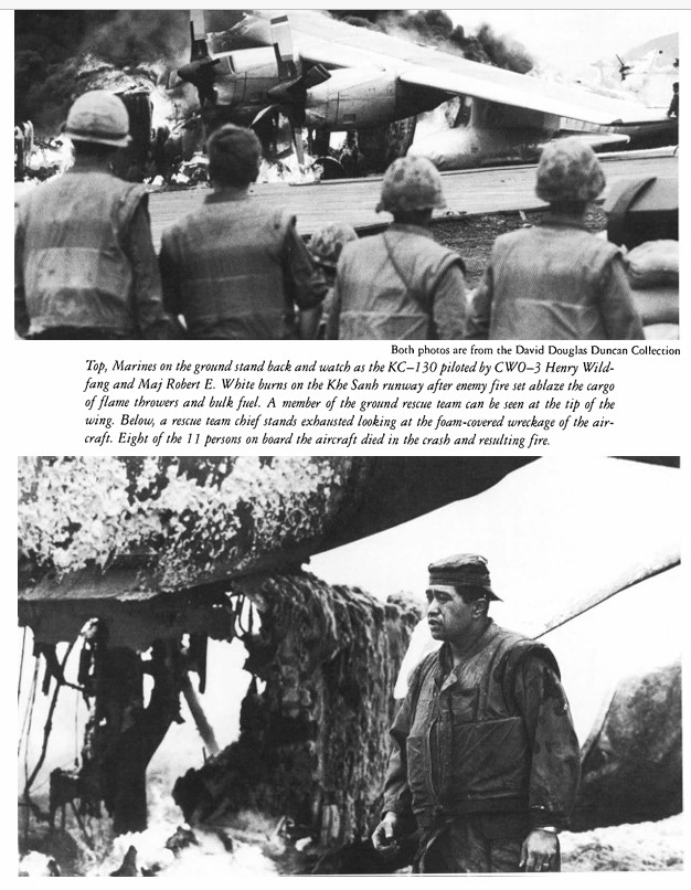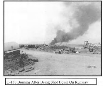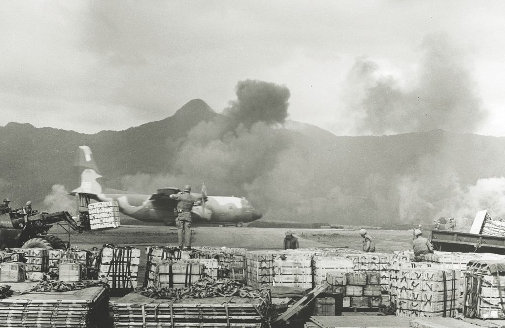 (Original Caption) A C-130 Hercules transport, taxis down runway with a load of combat essential supplies as fires from a previous night’s mortar attack still burn in the background sometime in February. Communist gunners shot down a C-123 transport at the Khe Sanh landing strip, March 1st, injuring one passenger aboard the plane.